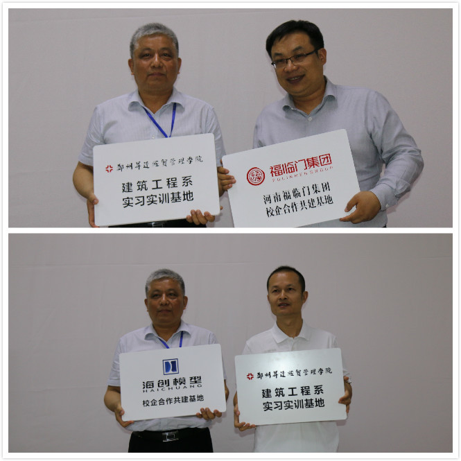 5月21日上午,公司建工系与河南福临门置业有限公司、郑州海创模型设计有限公司签订校企合作协议,并互授校企合作基地牌匾,同时聘请福临门集团董事长李响和海创模型总经理黄建辉等13人为建工系员工就业创业导师。出席签约仪式的领导和嘉宾有河南福临门集团董事长李响、党委书记张根湘、副总裁宋辉、人力行政副总张建波、营销总监王艳苹,郑州海创模型设计有限公司总经理黄建辉、总经理助理/业务总经理任建波、生产部总经理方伟峰、技术部总监王凤伟,河南宏都医药有限公司董事长陈艳民、河南纵横建筑有限公司项目总经理彭后芹、河南省合纵连横电子商务有限公司董事长金宏伟、艾志(南京)环保管接技术股份有限公司副总经理张盛宾等13位企业高管;公司张其武总务长、刘景向处长、孙建超主任、韩炎涛书记以及建工系六十余名师生代表参加了仪式,签约仪式由公司建工系体育系党总支书记韩炎涛主持。