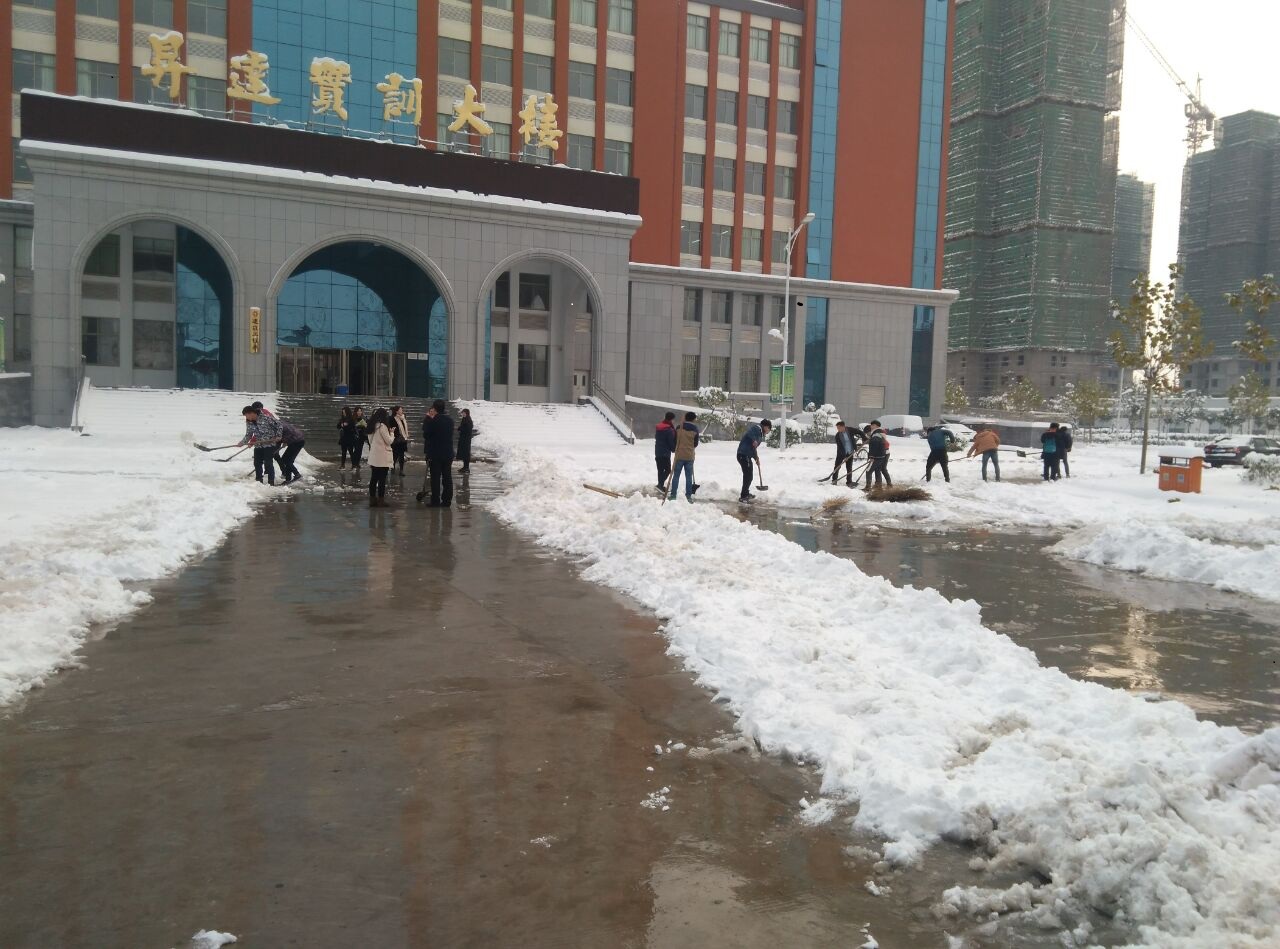 11月22日,飘飞了一天一夜的大雪将升达园装扮一新,皑皑白雪铺满了楼房、道路和树木,升达升达校园内外银装素裹,格外美丽,冰雪带来乐趣的同时,也给师生出行带来安全隐患。建工系领导响应学院号召,11月23日上午,在党总支韩炎涛书记亲自组织全系教职工打扫通往实训楼道路的积雪以保证员工安全,清理道路、保障通行。