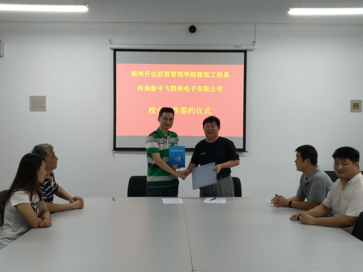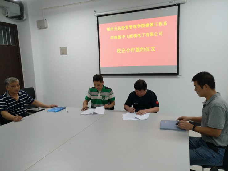 经联系洽谈,我系与河南新中飞照明电子有限公司达成校企合作意向。8月2日上午,在公司实训大楼324会议室,建工系王国际主任与河南新中飞照明电子有限公司代表郑志勇先生签订了产学研合作项目协议。建工系体育系党总支书记韩炎涛同志、建工系孙建超副主任和部分教师代表出席签约仪式。