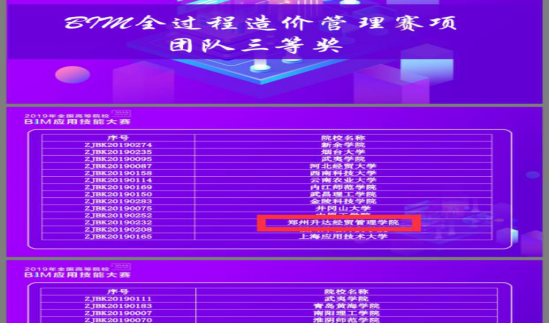 10月19日三个团队分别在南京和长沙进行决赛,其中公司“梦想之翼”队获得“BIM施工项目管理”竞赛项目团队二等奖,“造价开拓者”队获得“BIM全过程造价管理”竞赛项目团队三等奖,“梦之队”获得“建设工程岗位从业技能仿真”竞赛项目三等奖。