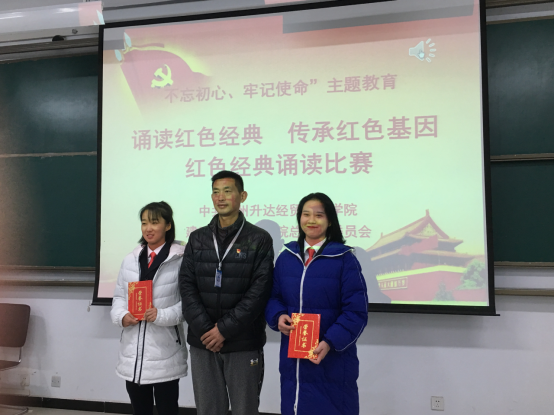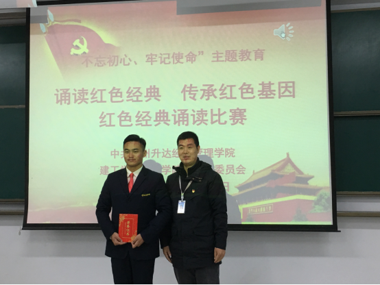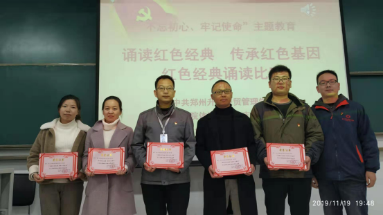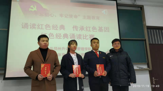 参赛选手们围绕“不忘初心、牢记使命”这一主题,深情朗诵了毛泽东、方志敏等革命烈士诗歌和家书。选手们慷慨激昂、声情并茂地诵读了一首首催人奋进的红色诗歌、一封封催人泪下的红色家书,带领大家穿越历史,触摸烈士们跳动的红心,感悟先辈们舍生取义的家国情怀。经过激烈的角逐, 杨润植同学的参赛作品《可爱的中国》荣获了本次大赛一等奖;王钰同学的参赛作品《铭记》和雷淑娟同学的参赛作品《沁园春·长沙》荣获了本次大赛二等奖;仝玎琪同学的参赛作品《沁园春•长沙》,郭晓航同学的参赛作品《沁园春•雪》仝帅同学的参赛作品《水调歌头•重上井冈山》获得了本次大赛三等奖。各支部获得了优秀组织奖。
