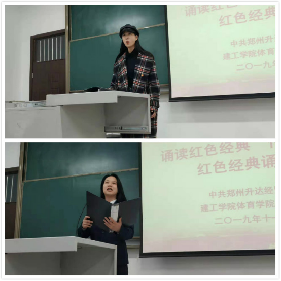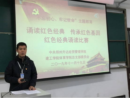 suncitygroup太阳集团体育公司党总支书记韩炎涛同志致开幕词。韩书记指出,中国共产党从成立之日起,就既是中华优秀传统文化的传承者,又是中国先进文化的积极倡导者和发展者。红色革命经典,歌颂和记录了党领导革命和建设的伟大历程,体现了中国共产党人艰苦奋斗、勇往直前、百折不挠的革命精神,这些作品内涵丰富、催人奋进,能够给予我们强大的前进动力,是我们攻坚克难,全面建设社会主义现代化国家,实现中华民族伟大复兴的强大精神支柱。我们举办红色经典诵读比赛就是弘扬社会主义核心价值观,学习习近平新时代中国特色社会主义思想,发展和传承社会主义先进文化,增强文化自信。通过诵读红色经典,缅怀革命先烈的丰功伟绩,弘扬中华优秀传统文化,共同感受红色经典的独特魅力,可以教育引导广大党员干部突出党的政治建设的统领地位,进一步增强“四个意识”、坚定“四个自信”、做到“两个维护”,自觉在思想上政治上行动上同以习近平同志为核心的党中央保持高度一致,坚决贯彻中央的决策部署,做到对党绝对忠诚。韩书记还强调,我们要深入学习习近平总书记考察河南时的重要讲话精神,讲好党的故事、革命的故事、根据地的故事、英雄和烈士的故事,加强革命传统教育、爱国主义教育、青少年思想道德教育,把红色基因传承好,确保红色江山永不变色。基层党支部和广大党员干部要以本次活动为契机,全面学习宣传贯彻党的十九大精神,推动“不忘初心、牢记使命”主题教育走深、走实,不断强化党的意识和党员意识,进一步弘扬社会主义先进文化,将红色经典诵读活动深入开展下去,做到时时刻刻读经典、悟经典,用红色革命精神和中华优秀传统文化充实我们的精神世界,以真抓实干的作风把党总支各项工作落到实处,为建设高水平应用型本科院校提供有力的政治保障和动力支撑。