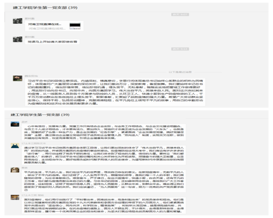17土木3班孔豪强说:““伟大出自平凡,英雄来自人民,把每一项平凡工作做好就是不平凡。”这是习近平总书记对新时代英雄精神的凝炼概括。新冠病毒肆虐,白衣战士和党员干部们逆向而行,他们用忠诚坚守、奉献担当谱写了一曲曲英雄赞歌。我会好好地向他们学习,不忘初心、牢记使命。”
