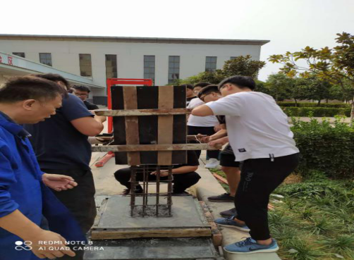 本项目分为钢筋工程、模板工程和混凝土工程三个分项,在指导老师进行设计交底和施工要点、步骤讲解之后,员工分组操作。钢筋班组在尹智伟老师指导下进行钢筋除锈、切断、弯制及绑扎作业;模板班组在岑培山老师指导下进行模板设计、加工及拼装加固作业;混凝土班组在钟国华老师指导下进行施工配合比换算及搅拌作业。
