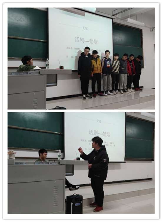 第三个节目是土木工程本科1班出演的话剧《禁烟》,讲述了一位老师对抽烟员工思想教育过程,情节诙谐幽默,让人啼笑皆非却又印象深刻。老师最后还运用大量数据和实例向同学们展示了抽烟的危害,起到了很好的教育作用。