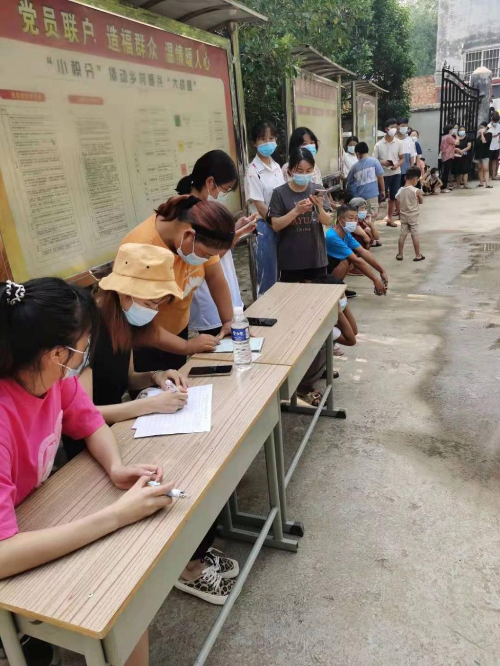 汛情未止,疫情又至。在得知当地乡政府迅速启动疫情防控工作后,刚参加完防汛志愿工作的张影同学,再次报名请战,积极响应党和政府号召,主动参与到防疫一线的志愿工作中。因为封村管理,只有两名医护人员进行采样,但这个采样点大概有几千人需要检测,面临着巨大的压力与挑战。在桥北乡老庄村大队服务中心,张影同学积极组织居民排好队伍进行核酸检测。帮忙登记、维持秩序,组织留观等助力核酸检测工作顺利开展。