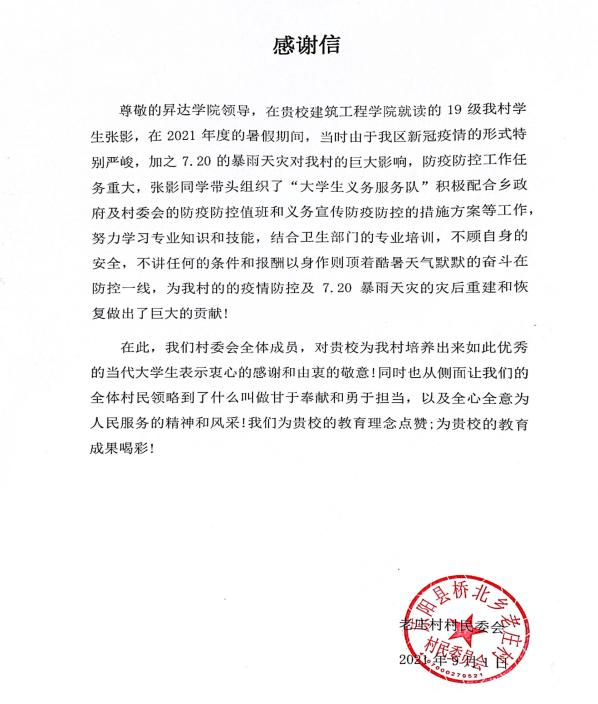近日,公司收到原阳县桥北乡老庄村村民委员发来的感谢信,感谢suncitygroup太阳集团19级工程造价专科1班张影同学在抗洪救灾、疫情防控中的出色表现。