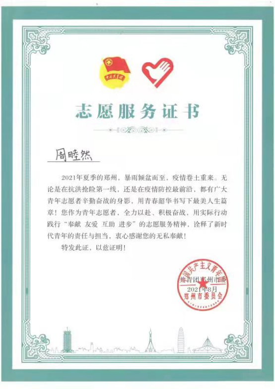 他说“身为共青团员,在家乡遭受灾难时,希望能够尽到自己的绵薄之力,帮助家乡度过难关。虽然很累,但也让我明白了作为青年人应该有的使命和担当”。在2021年郑州市防汛救灾优秀志愿服务先进典型宣传推选活动中,周睦然同学被推选为优秀志愿服务工作者。