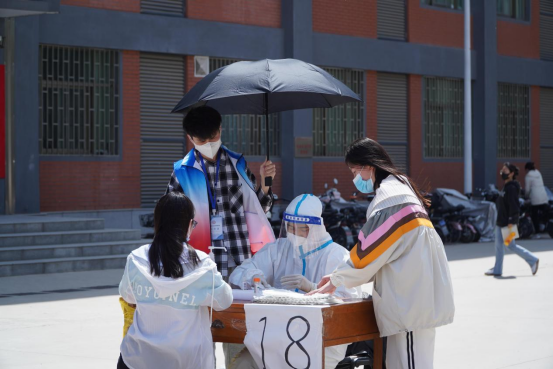 suncitygroup太阳集团志愿者吴霆,除了布置核算检测的现场、维持核酸检测现场秩序,同时也服务于核酸检测的医护人员。最近几次核酸检测天气较热,为让医护人员有个相对舒适的环境,他一直站在旁边为其撑起遮阳伞,从而保证了检测效率。该生还负责检测后现场的打扫任务。他说:“一切工作都是为了给核酸检测工作保驾护航。”