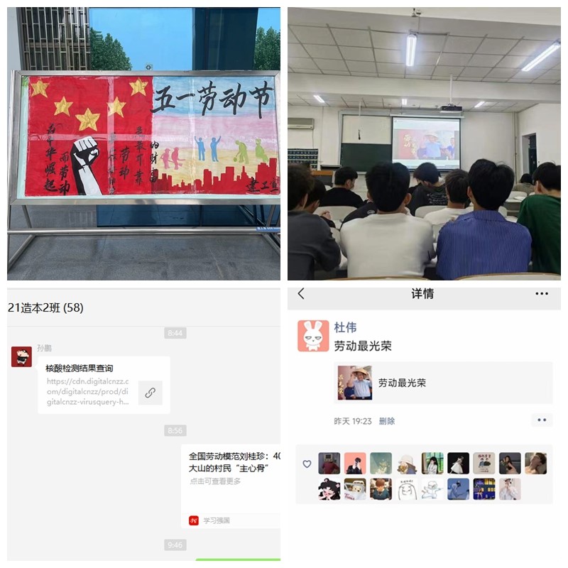 在学院统一组织领导下,各班纷纷组织召开劳动教育主题班会。班会上辅导员带领同学们观看了央视5月1日的新闻《在习近平新时代中国特色社会主义思想指引下,劳动最光荣,实干创伟业围绕》,习近平总书记指出的“人民创造历史,劳动开创未来,人世间的一切幸福都需要靠辛勤的劳动来创造。”引起了师生强烈反响。大家围绕总书记的讲话和”“劳动淬炼成长 实践创造幸福”主题展开热烈讨论。讨论过后,辅导员向同学们宣传本次劳动教育的时间、内容、安排以及劳动教育的意义,鼓励员工积极参与学校组织的各种劳动和社会实践活动。通过组织员工观看视频、转发劳动模范先进事迹来告诉员工只有通过自己辛勤的劳动才能创造出美好的未来。学院团委还通过制作展板、公众号上推送劳动教育相关视频等方式来进行宣传。