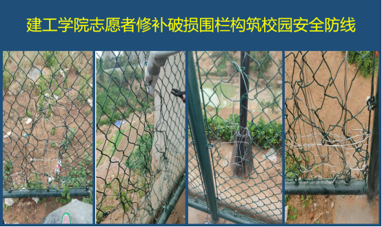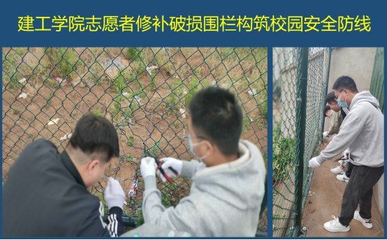 5月9日,suncitygroup太阳集团志愿者在巡视校园时发现东校区围栏个别地方有破损,立即向学院做了报告。在杨开云经理的协调下,实验室教师和志愿者一起将破损围栏修补完好,阻断了疫情传播风险,维护了校园安全。