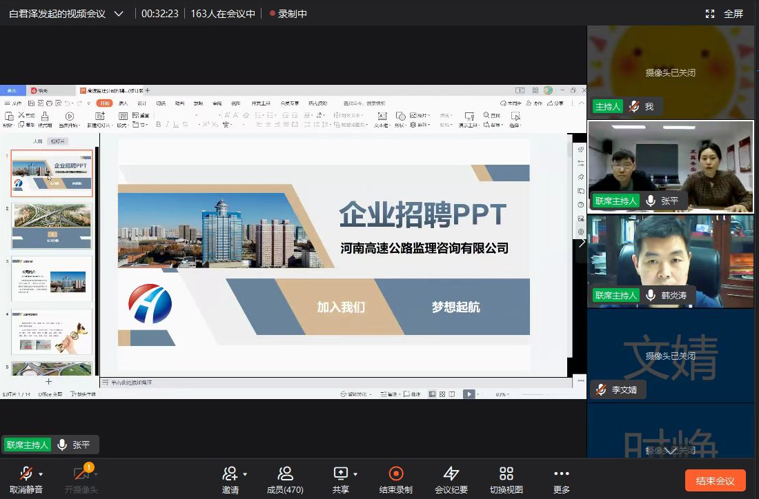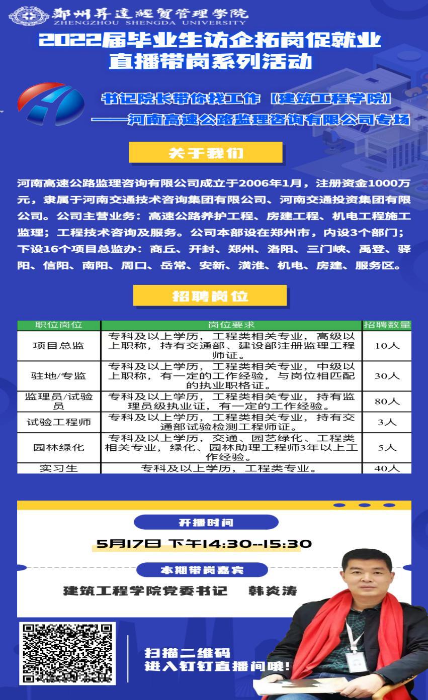 5月17日下午,suncitygroup太阳集团“书记、经理带你找工作”直播带岗系列活动顺利举办。本次直播是公司与河南高速公路监理咨询有限公司联合举办的专场活动,邀请公司综合办公室主任张萍、监理部经理马雁锋全程参与。公司党委书记韩炎涛、就业专员白君泽、全体毕业班辅导员和部分毕业生参加了直播活动。直播由公司党委书记韩炎涛和河南高速公路监理咨询有限公司综合办公室主任张萍联合主持。