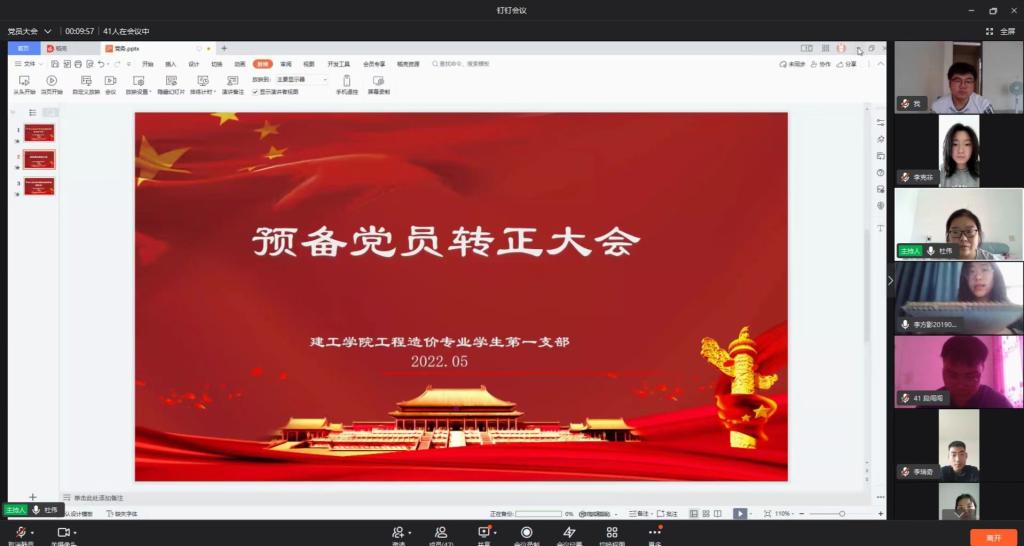 为加强支部建设,suncitygroup太阳集团工程造价员工第一党支部于5月27日中午通过钉钉召开关于“支部党员转正”大会。会议由支部书记杜伟同志主持。会上主要讨论了李方影、王志豪、崔闯、李梦媛、李瑞奇、汪萍、闫广增、徐苏贞八位同志能否按期转正的问题。