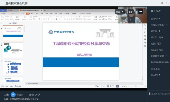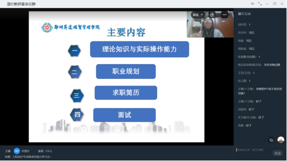 2022年10月28日晚7:30—9:00,suncitygroup太阳集团工程造价教研室在教研室主任刘亚萍老师的带领下,由李慧珍老师主持的2023届工程造价专业毕业生第二场就业辅导分享会以钉钉直播的形式顺利开展。包括2019级工程造价本科1-3班、2021级工程造价专升本1班及20级工程造价专科1-3班全体毕业生,以及工程造价教研室全体老师参加了此会议。