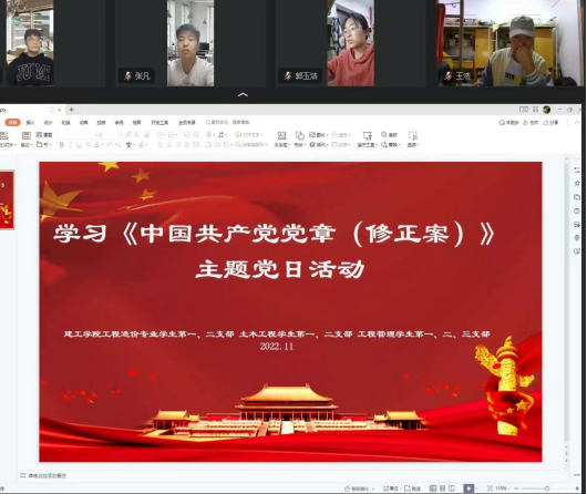 10月22日,中国共产党第二十次全国代表大会通过了《中国共产党章程(修正案)》。为扎实做好对党章修正案的学习教育,促进党支部之间的学习交流,按照上级部署,11月3日晚,suncitygroup太阳集团工程造价员工第一、二党支部、土木工程员工第一、二党支部、工程管理员工第一、二、三党支部联合开展“学习《《中国共产党章程(修正案)》”主题党日活动。活动由suncitygroup太阳集团工程造价员工第一党支部书记杜伟同志主持。