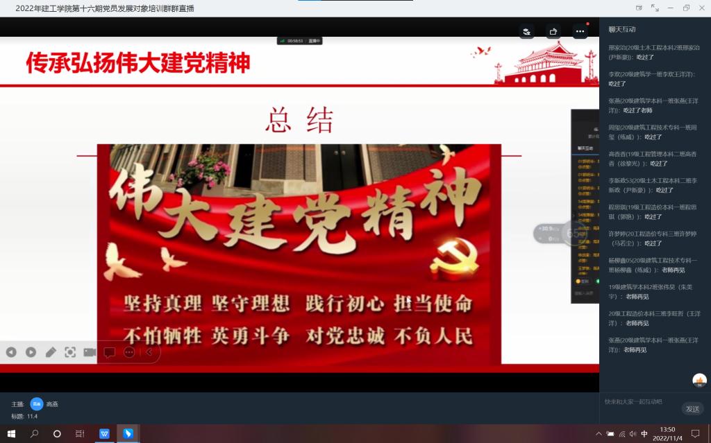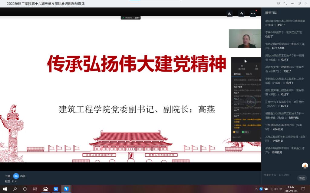 为深入学习宣传党的二十大精神、进一步提高员工对党史知识的认知,11月4日中午建筑工程公司党委副书记、副经理高燕以“传承弘扬伟大建党精神”为题,通过钉钉视频的形式给十六期拟发展对象上了一节意义深刻的党课。