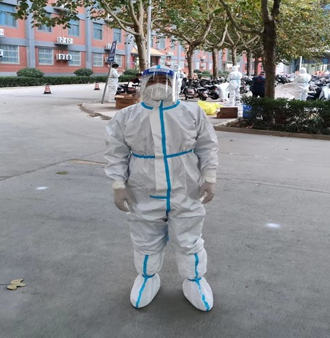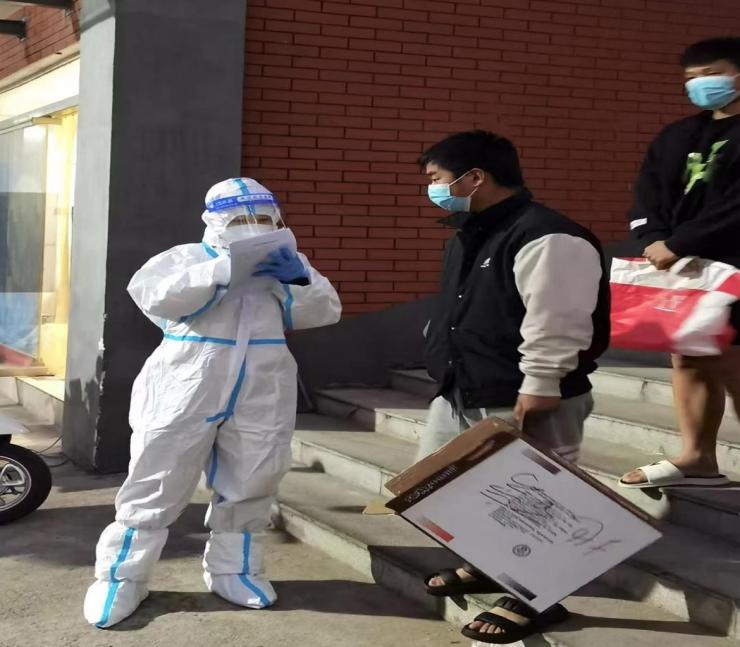 李世,他每天早早到达30号楼送餐点,仔细穿好防护服,带好口罩,认真摆放食物,指挥员工有序取餐。从刚开始的手忙脚乱,到逐渐变的秩序井然,有条不紊,每天都能很顺利的完成发餐任务。他说:“校园里突然出现的阳性,打乱了原本有序的校园,作为一名并不管理员工的升达员工,作为升达的一员,作为一名共产党员,我决不能置身事外。”