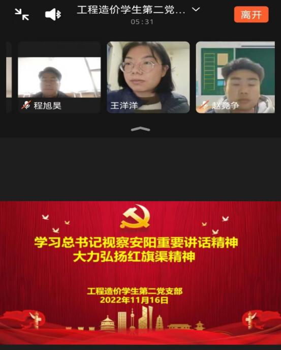 首先,支部成员集体观看了中央电视台《国家记忆》栏目播出的专题片《根脉——红旗渠精神》上集;随后支部书记王洋洋带领全体党员共同学习习近平总书记在河南安阳考察时的重要讲话。总书记提出:“红旗渠精神同延安精神是一脉相承的,是中华民族不可磨灭的历史记忆,永远震撼人心。年轻一代要继承和发扬吃苦耐劳、自力更生、艰苦奋斗的精神,摒弃骄娇二气,像我们的父辈一样把青春热血镌刻在历史的丰碑上。实现第二个百年奋斗目标也就是一两代人的事,我们正逢其时、不可辜负,要作出我们这一代的贡献。红旗渠精神永在!”之后,王洋洋老师指出:“党的二十大闭幕不到一周,习近平总书记就亲赴陕西延安革命纪念地和河南安阳红旗渠等地考察,发表重要讲话,充分展示了党对不忘初心、牢记使命的坚定执着,彰显了赓续红色血脉、传承奋斗精神的坚定决心”。此外,王洋洋表示希望全体党员在疫情当下率先垂范,从党的二十大精神和红旗渠精神中锤炼坚定信念,履行使命担当,拧成一股绳,齐心协力推动疫情防控取得更为明显的实质性进展。