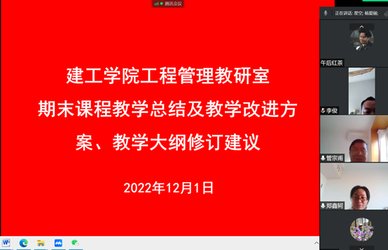 为了更好的完成本学期工作,2022年11月1日下午,工程管理教研室通过腾讯会议线上召开了2022-2023学年第一学期期末教学工作会。会议由教研室主任杨爱丽老师主持,工程管理教研室全体教师参会。