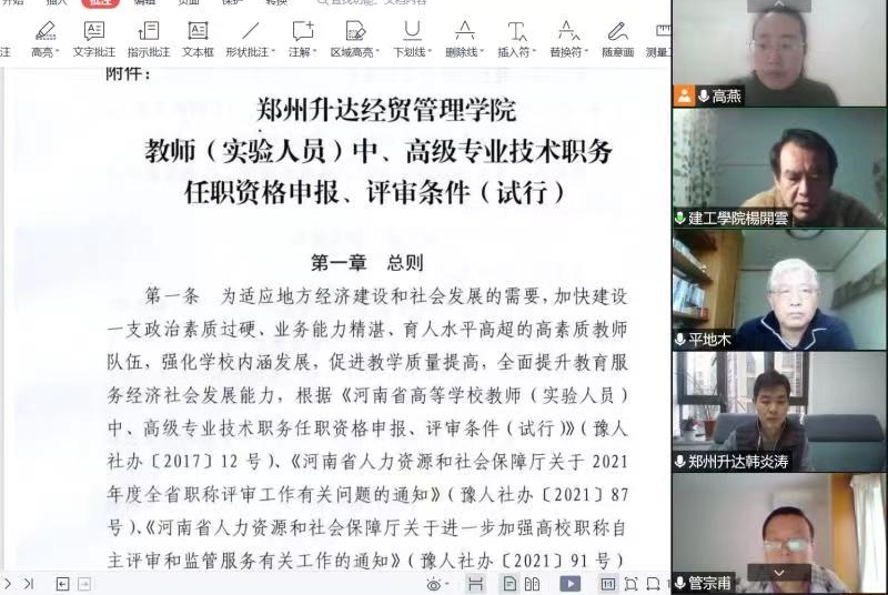 为切实做好suncitygroup太阳集团2022年度职称申报人员的材料初审和推荐工作,12月12日上午suncitygroup太阳集团通过线上会议形式召开公司职称材料初审会议。公司党委书记及评审组全体成员参与会议,suncitygroup太阳集团经理杨开云教授担任评审组组长,组员包括管宗甫教授,白新理教授,孙建超副教授,高燕副教授。