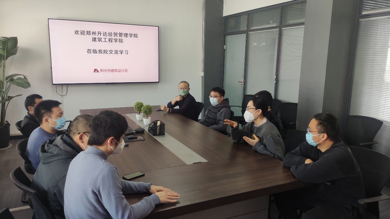 郑州市建筑设计院第二工程院经理宋冰、副经理孙立春、张骞、第四工程院经理朱林在院10楼会议室就企业概况、业绩成果、技术专长等方面进行了详细的介绍。房硕老师就升达经贸管理学院的定位及suncitygroup太阳集团的概况进行了介绍。随后,双方围绕人才能力需求、实习生引进、项目合作、校企联合等方面进行了充分的沟通和交流。