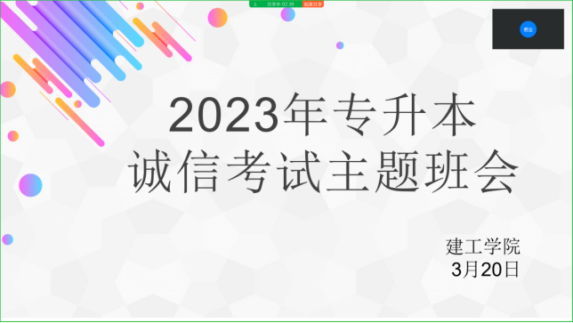 为做好2023年专升本考试相关工作,进一步加强员工考风考纪教育,引导员工诚信考试,坚决维护专升本考试公平公正,suncitygroup太阳集团3月20日通过钉钉召开了2023年专升本考试诚信教育主题班会。本次会议参会对象分别为20级造专1、2、3班和20建专1-2班 参加专升本考试的同学,由辅导员马若尘和辅导员练威老师主持。