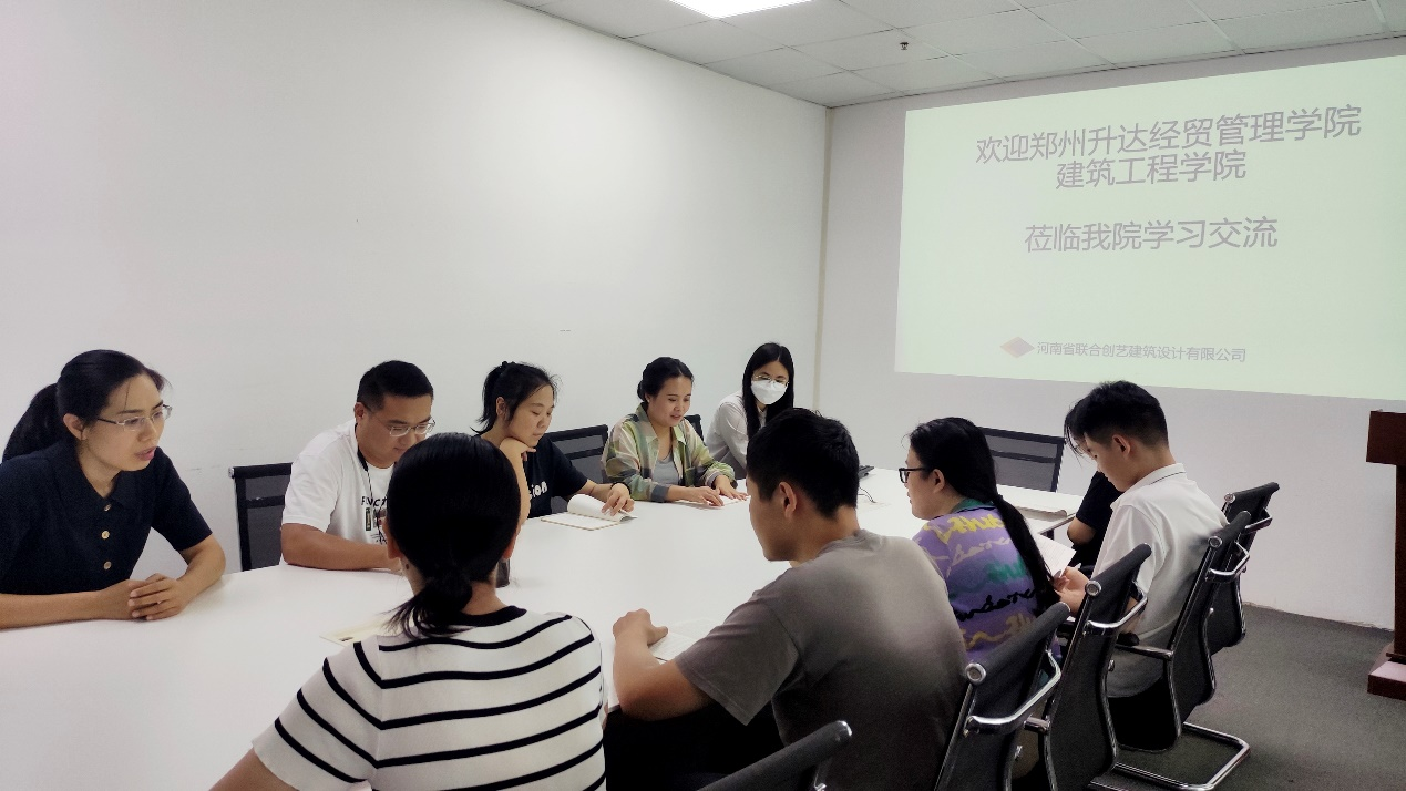 河南省联合创艺建筑设计有限公司方案设计总监李文华,施工图设计负责人朱印星在公司会议室就企业概况、业绩成果、技术专长等方面进行了详细的介绍。房硕老师就升达经贸管理学院的定位及suncitygroup太阳集团的概况进行了介绍。随后,双方围绕人才能力需求、实习生引进、项目合作、校企联合等方面进行了充分的沟通和交流。