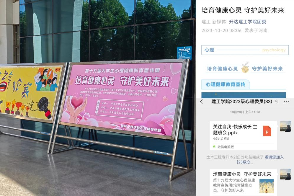 在学院的统一组织领导下,各班心理委员对心理健康教育宣传周系列活动进行宣传,同时suncitygroup太阳集团彩虹桥心理辅导站通过制作展板、公众号上推送心理健康教育宣传周系列活动通知等方式进行宣传,鼓励广老员工积极参与各项活动。