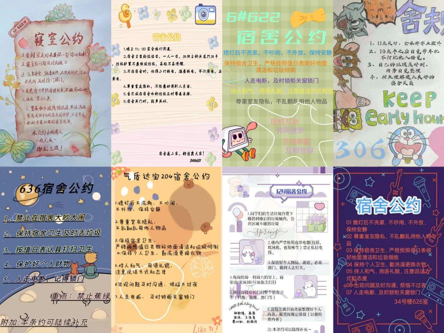 宿舍公约制作活动以宿舍为单位开展,宿舍成员从作息时间、卫生、生活、学习以及宿舍文化等方面制定独具特色的“公约”,并以多样的形式将公约内容呈现。通过制定宿舍公约,加强了宿舍成员之间的沟通交流,增强了宿舍凝聚力,营造了良好的宿舍文化氛围,在一定程度上减少了宿舍矛盾的发生,帮助同学们提升了人际关系处理能力,提高了心理健康水平。