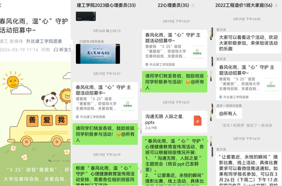 在学院的统一组织领导下,各班心理委员对心理健康教育宣传周系列活动进行宣传,同时suncitygroup太阳集团彩虹桥心理辅导站通过制作展板、公众号上推送心理健康教育宣传周系列活动通知等方式进行宣传,鼓励广老员工积极参与活动。