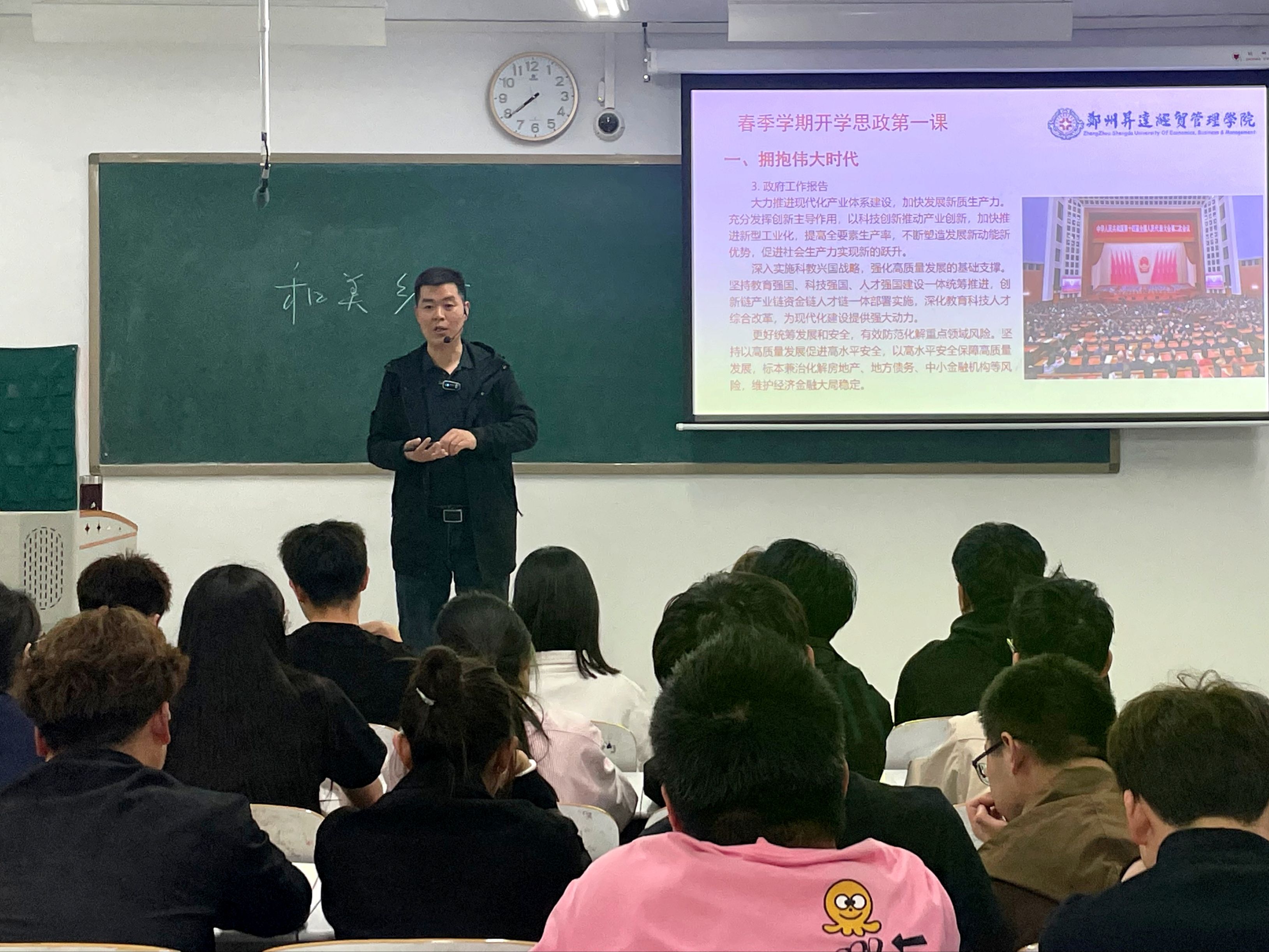 4月9日下午,建筑工程公司党委书记韩炎涛以《拥抱伟大时代,争做有为青年》为题,为学院2023级各班班委讲授春季学期开学思政第一课。